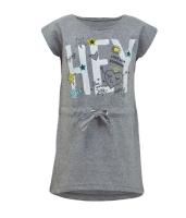 Платье из х/б трикотажа, с красочным принтом, украшенным блестящей краской. Прямой силуэт, Горловина с внутренней стороны отделана трикотажным кантом. Заниженная пройма, спущенное плечо. В поясе на кулиске с завязками из трикотажа. Спинка удлиненная, с полукруглым низом.Размер 98 длина 47 см, обхват груди 52 см.