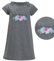 Платье темно серого цвета, из х/б трикотажа. Расклешенный силуэт. Горловина на трикотажном манжете, с отделкой рюшечкой. Рукав реглан. Платье украшено вышивкой "цветы" и надписью-вышивкой со стразами.Размер 98 длина 47 см, обхват груди 54 см.