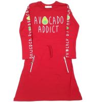 Платье для девочки с принтом "авокадо" на груди и рукавах. Горловина на тонком манжете. Отрезное по талии, на талии баска со шнурком. Юбка расклешенная, с небольшим разрезом слева. На юбке два прорезных кармана с застежкой молния.Размер 134: длина- 79 см, обхват груди- 69 см, длина рукава- 48 см.