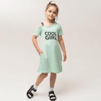 Платье из эластичного х/б трикотажа. Расклешенный силуэт. Горловина на манжете, с кроем, открывающим одно плечо. Лямочка из тесьмы с надписями. На груди крупная надпись из страз.Два прорезных кармана в боковых швах.Размер 116: длина- 55 см, обхват груди- 64 см.