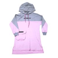 Платье с капюшоном для девочки, из эластичного, х/б футера, двухцветное. Силуэт трапеция. Заниженная пройма, спущенное плечо. На груди надпись. Капюшон со шнурком. Рукав на трикотажном манжете. Один накладной карман с клапаном, украшен нашивкой из ткани с надписями. По бокам, снизу, небольшие разрезы.Размер 134: длина 70 см, обхват груди 84 см, длина рукава 37 см.