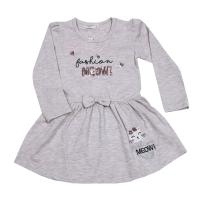 Платье для девочки, из эластичного, х/б трикотажа, с вышивкой-надписью на груди, украшенной пайетками и принтом-вышивкой "кошечка" на юбочке, из пайеток, трикотажа и ткани с люрексом. Горловина отделана трикотажным кантом. Рукав присобран у плеча. Отрезное по талии. На талии бант из трикотажа. Юбочка со сборкой по талии.Размер 98: длина- 53 см, обхват талии- 54 см, длина рукава- 36 см.