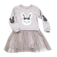 Платье для девочки, из эластичного, х/б трикотажа.Полочка из футера, с красочным принтом-вышивкой "зайка" из трикотажа, украшенным пайетками. Горловина, рукав на трикотажных манжетах. На рукавах декоративные заплатки "зайки" из трикотажа. Отрезное по талии. На талии баска, имитирующая трикотажный манжет. Юбочка из трикотажа кулирное полотно, дополнена верхней юбочкой из фатина, со сборкой по талии.