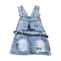 Сарафан из джинсы, с декоративными потертостями и принтом-вышивкой "башня у моря", украшенной бусинами и стразами. Отрезной по талии, с регулируемыми бретелями. На поясе шлевки, плетенный, из шнура с люрексом, ремешок с застежкой. По бокам на поясе застежки пуговицы. Два боковых прорезных кармана и один накладной карманчик. На юбочке надпись вышивка, украшенная бусинами и стразами.Размер 92: длина 44 см, обхват талии 52 см.