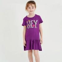 Платье для девочки, из х/б трикотажа, с красочным принтом-надписью, украшенным глиттером. Силуэт "трапеция", с широким воланом по низу. Горловина на трикотажном манжете. Короткий, втачной рукав.Размер 92 длина 49 см, обхват груди 56 см.