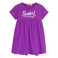 Платье для девочки, из х/б трикотажа, с красочным принтом"сладкая клубничка", украшенным глиттером. Широкий крой. Отрезное по завышенной линии талии. Горловина отделана трикотажным кантом. Короткий, втачной рукав. Юбочка присобрана по талии.Размер 92 длина 54 см, обхват груди 60 см.