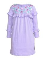 Платье для девочки, из х/б трикотажа, с ярким цветочным принтом на груди. Расклешенный силуэт, со сборкой по кокетке. Кокетка с рюшей на полочке и рукавах. Рюши на рукавах. Горловина отделана кантом. Застежка две кнопки на спинке.Размер 92 длина - 48 см, обхват груди - 55 см, длина рукава - 31 см.