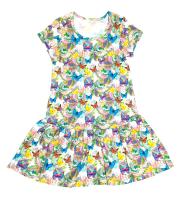 Платье для девочки, из х/б трикотажа с красочным принтом "бабочки". Горловина отделана трикотажным кантом. Низ платья отделан широким воланом.Размер 116 длина 57 см, обхват груди 58 см.