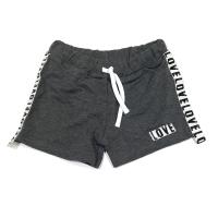 Шорты для девочки, из эластичного трикотажа. Прямой крой, укороченные. В поясе на закрытой резинке, со шнурком. На одной штанине нашивка и по бокам лапмасы из резинки с надписями.Размер 116: длина 20 см, обхват талии 46-52 см.