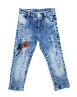 Джинсы с декоративными разрезами и потертостями, вышивкой-аппликацией "роза" из ткани и вышитой из пайеток надписью. Джинсы зауженного кроя, на пояске со шлевками, сзади на кокетке. На пояске, со стороны спинки, с внутренней стороны, вшита резинка и пуговицы для регулирования резинки. Ширинка с застежкой молния и пуговицей на поясе. Два боковых прорезных кармана спереди. Сзади два накладных кармана с декоративными надрезами. На поясе, сзади, фирменная нашивка из иск.кожи.Размер 98: длина 69 см, длина (без отворота) 46 см, обхват талии 46 см.