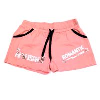 Шорты для девочки, укороченные, прямого кроя, из эластиного, х/б трикотажа. В поясе на закрытой резинке, со шнурком. Два боковых, прорезных кармана, отделаны трикотажным кантом. Украшены блестящими надписями.Размер 140: длина 23 см, обхват талии 56-62 см.