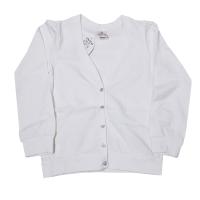 Кардиган для девочки из эластичного х/б трикотажа. V-образный вырез. Горловина на тонком, рукав и низ кардигана на широком манжете. Застежка пуговицы со стразами по центру, по всей длине. Рукав со сборкой у плеча. Украшен принтом-вышивкой "роза" на груди, и по низу кардигана.Размер 128: длина- 44 см, обхват груди- 66 см, длина рукава- 45 см.