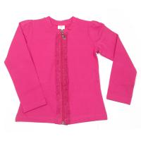 Мастерка для девочки полуприталенного силуэта на замке. Рукав с небольшой сборкой по плечу. Горловина обработана трикотажной манжетой. Переднее полотнище украшено синтетическим гипюром вдоль замка.Размер 98: Длина - 37 см, обхват груди - 52 см, длина рукава - 35 см.