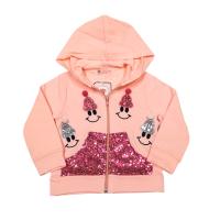 Мастерка с капюшоном для девочки. Полочка украшена вышивками-аппликациями из пайеток и помпончиков. Карман-кенгуру вышит пайетками. Рукав, низ мастерки на манжете.Размер 86: длина 34 см, обхват груди 56 см, длина рукава 30 см.