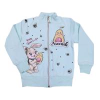 Мастерка для девочки, утепленная, из эластичного, х/б футера, с красочным принтом "авокадо", украшенным блестящей краской. Воротник-стойка. Рукав, низ мастерки на трикотажных манжетах. Застежка молния по центру, по всей длине.Размер 92: длина- 40 см, обхват груди- 62 см, длина рукава- 36 см.