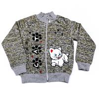 Толстовка-бомбер из эластичного х/б трикотажа с крупной аппликацией из велсофта "котенок" и термопечатью "лапки".  Горловина, рукав, низ толстовки на манжетах. Застежка молния