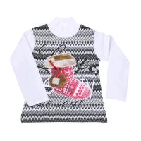Джемпер утепленный для девочки из х/б трикотажа. Декорирован красочным принтом "новогодние носочки" со вставками из ткани вел-софт. Полуприлегающий силуэт. Воротник-стойка из трикотажа.Размер 98: длина 39 см, обхват груди 56 см, длина рукава 33 см.