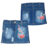 Юбка джинсовая, прямого кроя, с декоративными надрезами, вышивкой цветов, украшенной стразами. На поясе со шлевками для ремешка, сзади на кокетке. На поясе, с внутренней стороны спинки, вшита резинка и пуговицы для регулирования резинки. Ширинка с застежкой молния и пуговицей на поясе. Два боковых прорезных кармана, Сзади два накладных кармана с декоративными надрезами и вышивкой цветов на одном кармане.Размер 92: длина 23 см, обхват талии 50 см.