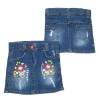 Юбка джинсовая, прямого кроя, с декоративными надрезами и яркой вышивкой цветов. На поясе со шлевками для ремешка, сзади на кокетке. На поясе, с внутренней стороны спинки, вшита резинка и пуговицы для регулирования резинки. Ширинка с застежкой молния и яркой пуговицей на поясе. Два боковых прорезных кармана, Сзади два накладных кармана с декоративными потертостями.Размер 92: длина 23 см, обхват талии 50 см.