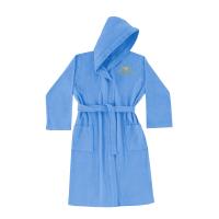 Халат для мальчика с капюшоном, из х/б махры. Без застежки, с запахом и пояском. На горловине, с внутренней стороны петелька для подвешивания. Два накладных кармана. Украшен вышивкой "корона" из блестящих ниток.Размер 164: длина- 95 см, обхват груди- 100 см, длина рукава- 36 см.