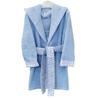 Детский махровый халат на запах, с поясом и глубоким капюшоном. Отличительная особенность халата с запахом — отсутствие застежек (пуговиц или молнии). Края халата перекрывают друг друга и завязываются мягким поясом из той же ткани, что и сам халат. Пояс пришит сзади, что очень удобно. По бокам без шлевок. Горловина с V-образным вырезом. Модель украшена нарядной тесьмой контрастного цвета, она располагается по линии горловины и капюшона, по линии пройм и низу рукавов. На горловине, с внутренней стороны петелька для подвешивания. Низ изделия обработан швом вподгибку двойной строчкой. Мягкий и комфортный халатик на каждый день.Размер 92: длина- 51 см, обхват груди 60 см, длина рукава- 28 см.