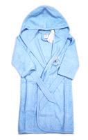 Махровый халат с капюшоном, запахом и пояском. Отделан трикотажным кантом. На горловине, с внутренней стороны петелька для подвешивания. Украшен вышивкой в морском стиле.Размер 116: длина- 65 см, обхват груди- 72 см, длина рукава- 36 см.