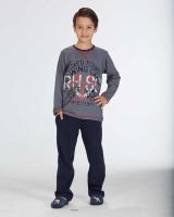Домашний костюм для для мальчика, из х/б трикотажа.Джемпер из трикотажа с мелкой тканной полоской, и ярким термо-принтом. Горловина отделана трикотажным кантом двух цветов. Джемпер украшен декоративными строчками.
