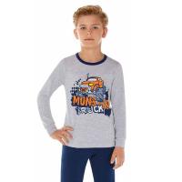 Пижама для мальчика из эластичного х/б трикотажа (кулирное полотно).Джемпер с красочным принтом "Monster truck" на груди. Горловина отделана трикотажным кантом. Рукава на манжете из основного материала. Низ изделия обработан швом вподгибку двойной строчкой.