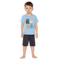 Пижама для мальчиков из эластичного х/б трикотажа (кулирное полотно), состоящая из футболки и шорт.Футболка прямого кроя. На полочке красочный рисунок "Динозаврики". Горловина круглая отделана трикотажным кантом в цвет изделия. Короткий втачной рукав. Низ изделия и рукавов обработан швом вподгибку двойной строчкой.