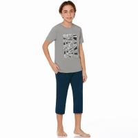 Комплект для мальчика из эластичного х/б трикотажа. Футболка с красочным принтом. Горловина отделана трикотажным кантом.Бриджи ниже колен на закрытой резинке в поясе. Два боковых прорезных кармана, отделанные трикотажным кантом.
