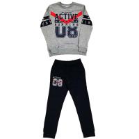 Костюм для мальчика. Джемпер прямого кроя. Рукава и низ изделия на манжетах. На полочке и рукавах принт. Штаны прямого кроя с боковыми карманами, в поясе эластичная резинка и шнурок, низ на манжетах.Рост 140 см, длина джемпера- 61 см, обхват груди- 84 см, длина рукава- 55 см, длина штанов- 86 см, обхват талии- 74 см.