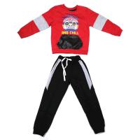 Костюм для мальчика, из х/б футера.Джемпер с красочным принтом на груди и карманом-кенгуру из болоньи. Горловина, рукав, низ джемпера на манжетах. На рукавах вставки из трикотажа другого цвета.