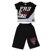 Костюм для мальчика из х/б трикотажа, состоящий из футболки и шорт.Футболка из трикотажа кулирное полотно, с крупной надписью на груди. Полочка из двух слоев трикотажа, верхний - свободно свисающий, с фигурным, отрезным краем. Срез необработанный. Горловина на трикотажном манжете. Украшена нашивкой из тесьмы с надписью. Низ изделия обработан швом вподгибку двойной строчкой.