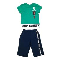 Костюм для мальчика.Футболка из х/б трикотажа, украшена декоративной нашивкой с надписью, рисунком и тесьмой, прикрепленной на полукольце на груди и крупной надписью по низу футболки. Горловина на манжете.