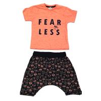 Комплект для мальчиков: футболка, шорты.Футболка из меланжевого трикотажа оранжевого цвета. Горловина обработана трикотажной манжетой, полочка украшена крупной надписью FEAR LESS.