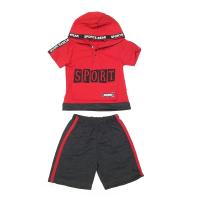 Костюм для мальчика.Футболка с капюшоном, из х/б трикотажа, с крупной надписью на груди и большим клапаном, украшенным декоративным элементом. Капюшон и рукава отделаны декоративной тесьмой с надписями. Застежка планка с клепками на груди. Низ футболки на манжете.