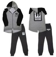 Cпортивный костюм для мальчика из х/б футер, состоящий из мастерки и брюк.Мастерка прямого кроя. Полочка украшена шевроном-нашивкой с дополнительным декором молния. Капюшон наполовину черный, наполовину серый, с декоративной утяжкой и люверсами, на подкладе из х/б трикотажа, с центральным швом сзади. Застежка молния по центру по всей длине изделия. Длинный рукав-реглан на трикотажном манжете, правый рукав дополнен термо принтом - полоски. Два кармана, расположенные в боковых швах. Низ изделия ассиметричный, спереди на трикотажном манжете, сзади без манжета, с разрезом по центру. Спинка удлинённая, украшена крупной термо-печатью с надписью "Caber 11".