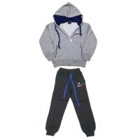 Костюм спортивный для мальчика. Мастерка на манжете. Капюшон на подкладе из х/б трикотажа, со шнурком. Рукав на манжете. Два прорезных кармана с манжетами и отделкой кантом. На полочке вышивка-эмблема. Штаны прямого кроя на манжетах, на резинке и шнурке в поясе. На штанах два боковых прорезных кармана. Украшены вышивкой-эмблемой.Размер 110 Мастерка: длина 44 см, обхват груди 72 см, длина рукава 43 см. Штаны: длина 60 см, обхват талии 48-54 см.
