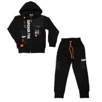 Костюм для мальчика, из эластичного футера.Мастерка с капюшоном, с нависной, односторонней кокеткой из болоньи, украшенной декоративной молнией, нашивкой из болоньи, украшенной надписями и неоновой смесовой лентой.На груди крупная надпись и накладной карман , с отделкой декоративной нашивкой с надписями и смесовой, светоотражающей лентой. Капюшон на подкладе из х/б трикотажа, с ярким, регулируемым, резиновым шнурком. Застежка молния по центру, по всей длине. Рукав, низ мастерки на трикотажных манжетах.