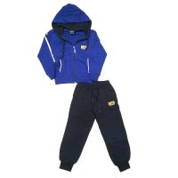Костюм спортивный для мальчика. Мастерка на манжете. Капюшон на подкладе из х/б трикотажа. Два прорезных кармана с манжетом и отделкой кантом. Рукав на манжете. На груди и рукаве яркие надписи и рисунки-трансферы. Штаны на манжетах, на резинке и шнуровке в поясе. Два боковых кармана. Возле кармана небольшой рисунок и надпись.Размер 110 Мастерка: длина 44 см, обхват груди 74 см, длина рукава 40 см. Штаны: длина 60 см, обхват талии 50-56 см.