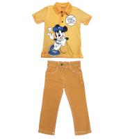 Костюм для мальчика, состоящий из футболки-поло и брюк.Футболка-поло из однотонного х/б трикотажа (кулирное полотно). Ткань футболки-поло декорирована с использованием текстильной краски. Полочка украшена принтом-термопечатями в тематике "Бейсбольная лига". Горловина круглая обработана классическим отложным воротником из основного полотна, в цвет изделия. На полочке планка, в цвет футболки-поло. На планке 3 пришивные пуговицы. Низ рукавов с двойным подворотом. Низ изделия обработан швом вподгибку двойной строчкой и двумя разрезами по бокам.