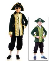 Карнавальный костюм для мальчика из 4 предметов: шляпа, камзол, брюки, наглазник.Шляпа из плотного иск.бархата, с отделкой декоративной золотой тесьмой. На полях шляпы апликация из пайеток. Камзол расклешеный книзу, из иск. бархата со вставкой из золотой иск парчи .Воротник рубашечного типа, с отделкой золотой тесьмой. Имитация карманов с отделкой золотой тесьмой. На спинке имитация пряжки с отделкой золотой тесьмой. Длинный рукав из иск. бархата, с отворотом из золотой иск. парчи. Застежка на пуговицы. Брюки свободного кроя, из иск. бархата, с резинками на поясе и на штанинах. Отделаны золотой тонкой тесьмой по краю штанин. Наглазник пластиковый на резинке.