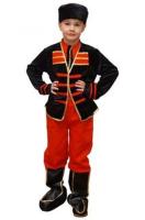 Карнавальный костюм для мальчика, из 3 предметов: кафтан, шаравары с сапогами, головной убор.Кафтан из иск. бархата, с патронником на груди. Воротник стойка. Без застежки. Отделан золотистым кантом. Рукав украшен полосками из смесовой ленты.