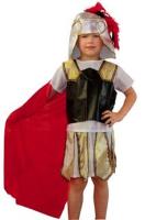 Карнавальный костюм римского воина для мальчика из 4 предметов: рубашка, птеруги(юбка с защитными пластинами), плащ, шлем.Рубашка с коротким рукавом из атласа. Горловина отработана трикотажным кантом с завязками. Птеруги - юбка из атласа на резинке с вшитыми в пояс вставками из парчи. Плащ из атласа и доспехами из кож.заменителя скрепленных по плечам вставками из органзы. Шлем из серебристой парчи на тонком паралоне, края обшиты золотистыми пайетками, Макушка шлема украшена перьями (боа).