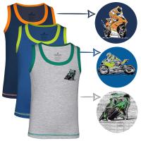 Майка для мальчика из эластичного х/б трикотажа. На полочке выполнен принт "Мото". Горловина и пройма окантованы трикотажным кантом, контрастного цвета. Низ изделия обработан швом вподгибку двойной строчкой.ВНИМАНИЕ! Товар продается по 3 шт. одного размера. Расцветка может прийти любая, из представленных на фото (цвета могут дублироваться).