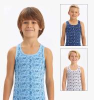 Майка для мальчика из эластичного х/б трикотажа, с рисунками и надписями. Горловина и проймы отделаны трикотажным кантом.Внимание: цвет может прийти любой из представленных на фото.