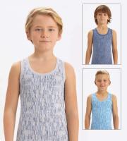 Майка для мальчика из эластичного х/б трикотажа с рисунками "буквы". Горловина и проймы отделаны трикотажным кантом.Внимание: расцветка может прийти любая из представленных на фото.