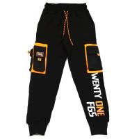 Штаны для мальчика, из эластичного футера. Снизу на трикотажных манжетах. В поясе на закрытой резинке, с ярким шнурком. Два боковых прорезных кармана. Два боковых накладных кармана с клапанами, отделанные яркой тканью болонья и украшенные смесовой лентой и прорезиненной наклейкой с надписями. Яркая надпись на одной штанине.Размер 110: длина 80 см, обхват талии 56-62 см.
