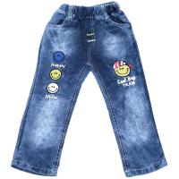 Джинсы для мальчиков. Пояс на резинке, 2 боковых кармана, шлёвки. Имитация гульфика украшена разноцветными петлями. Джинсы украшены декоративными потертостями и аппликациями "Смайл".Рост 86 см, длина- 42 см, обхват талии- 54 см.