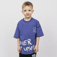 Футболка для мальчика прямого силуэта. Выполнена из хлопкового трикотажа - кулирное полотно. Передняя половинка декорирована смайликом и надписью на английском языке "никогда не расстраивайся". Вырез горловины круглый, форма выреза связана трикотажной эластичной резинкой. Горловина спинки внутри укреплена настрочной планкой из кулирки в тон. Рукав короткий со спущенной линией плеча. Низ изделия и рукавов обработан швом вподгибку двойной строчкой.Размер 98: длина- 42 см, обхват груди- 72 см.